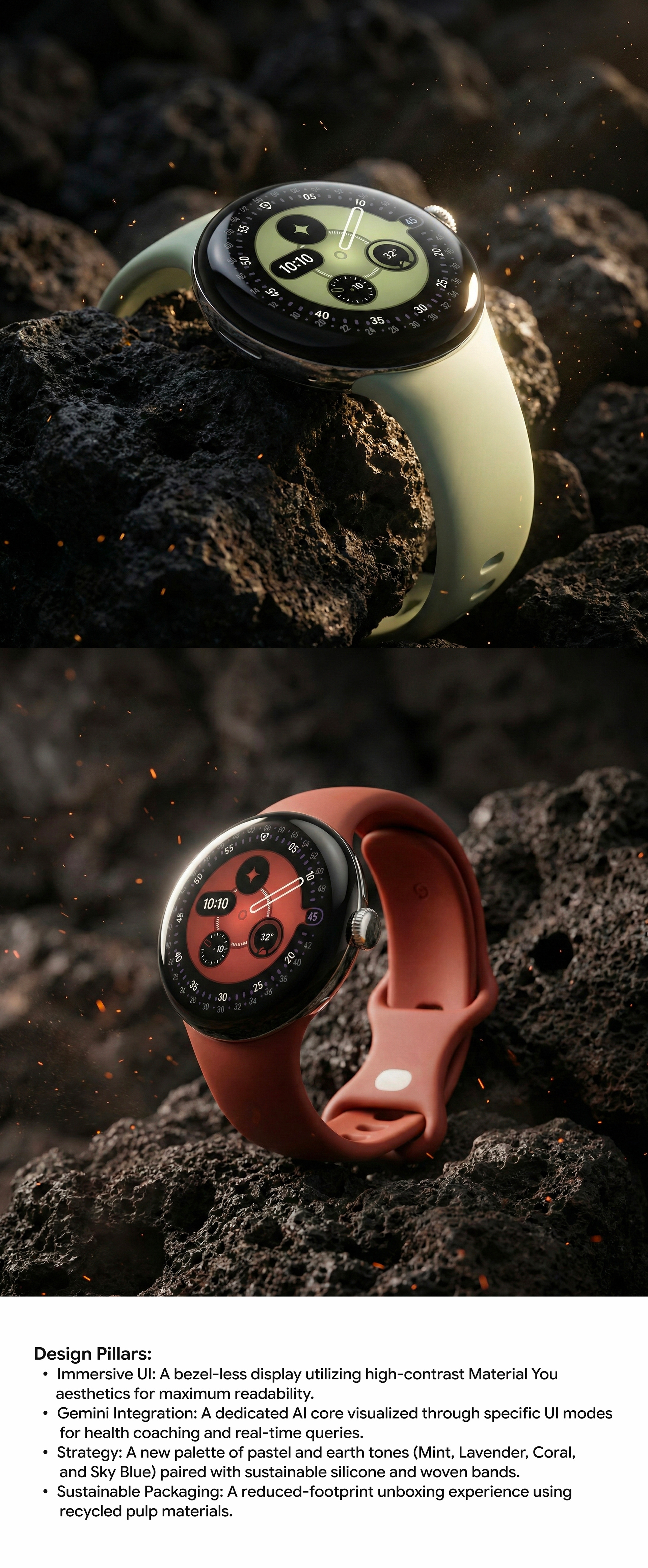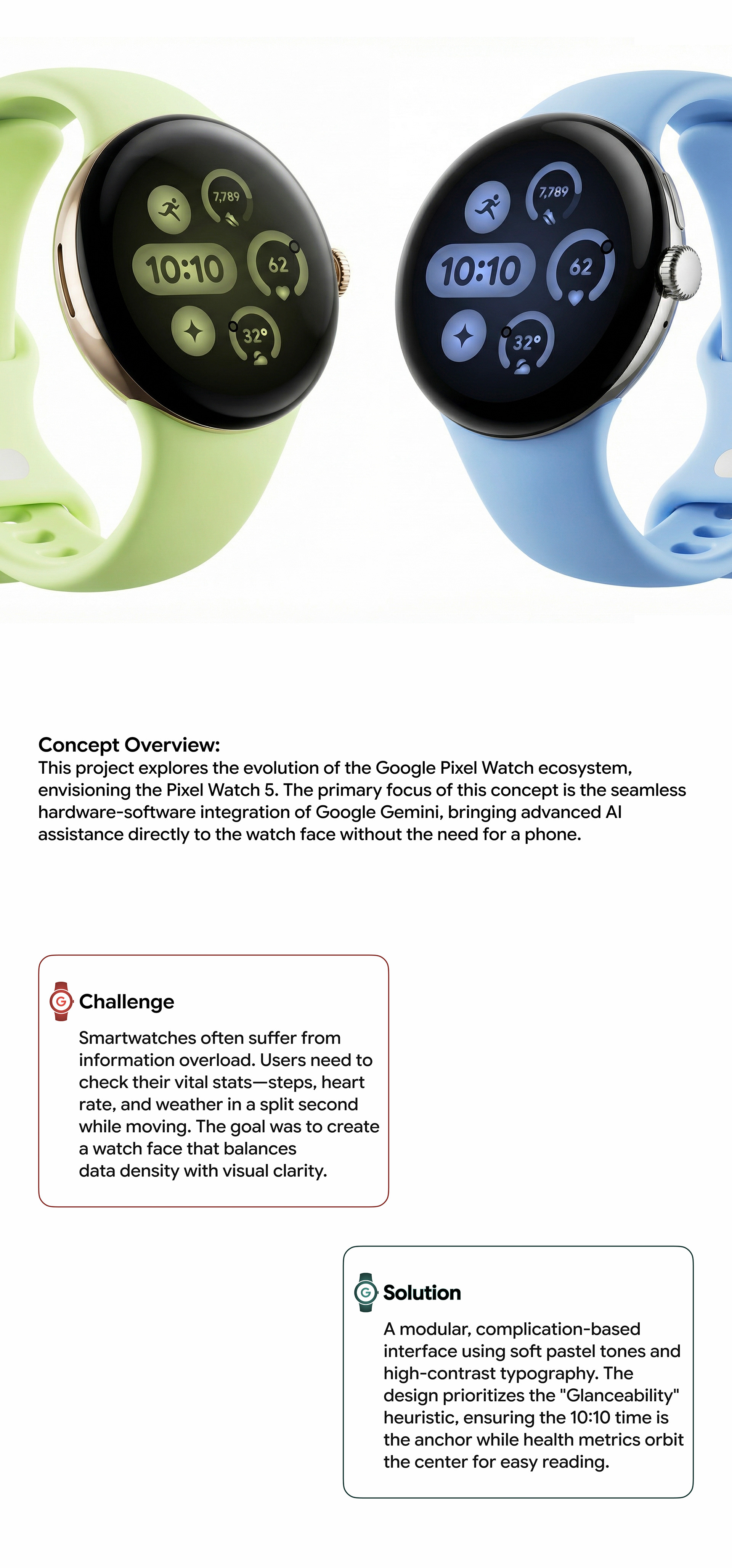 Project explores the evolution of the Google Pixel Watch ecosystem, envisioning the Pixel Watch 5. The primary focus of this concept is the seamless hardware-software integration of Google Gemini, bringing advanced AI assistance directly to the watch face without the need for a phone.